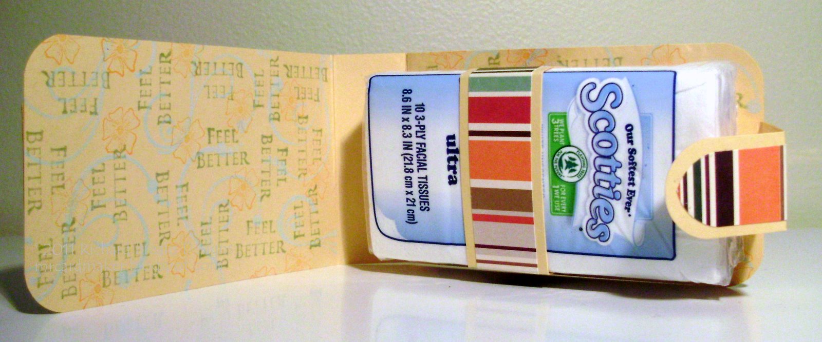 This is a pocket tissue holder.  I used a template given to me by my friend Amy Corr, and went to town.  The base is some Mostly Mustard cs by SU!, and the dp is from M&MBI.  I used a scalloped square punch and a small circle punch to make the clasp-y thing, and I had some ancient chipboard cut outs that I inked up with some StudioG chalk inks.  The brads are from Michael's.  I love how it perfectly fit the center of the flower.