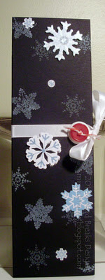 Inside this puppy is a 2 1/2" by 8" notepad from PTI.  I used a piece of GinaK Designs onxy cs cut at 5 1/4" by 8 1/2", scored in the middle to allow for a depth of 1/8".  I attached the pad with some scor-tape to the inside, and used some snowflake stamps from ScrappyCat (from my Goodwill store, no less) and some K&Co stickers to doll it up a bit.  The whole thing is tied together with some white ribbon.  A red button on top of a white one, tied with some red and white twine finishes it all off.