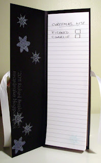 The inside---This could CLEARLY get really all jazzed up with some rhinestones and other colors, but I was really pressed for time.  Oh yeah, I also stamped a snowflake in pale blue on each of the pages of the pad.  'Cause I'm decorative that way.  Yes, I am.  I have a pack of ten (I think) of these pads.  I will do more!!!