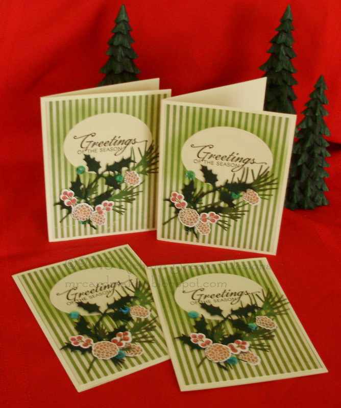 ReplyDeleteI love your Christmas cards. I really like the first one with all the tiny stamps. It looks like fun and creative; but not too hard. It inspires me for Valentines cards. The sponging on the green striped card is very cool. I love how it makes a frame.