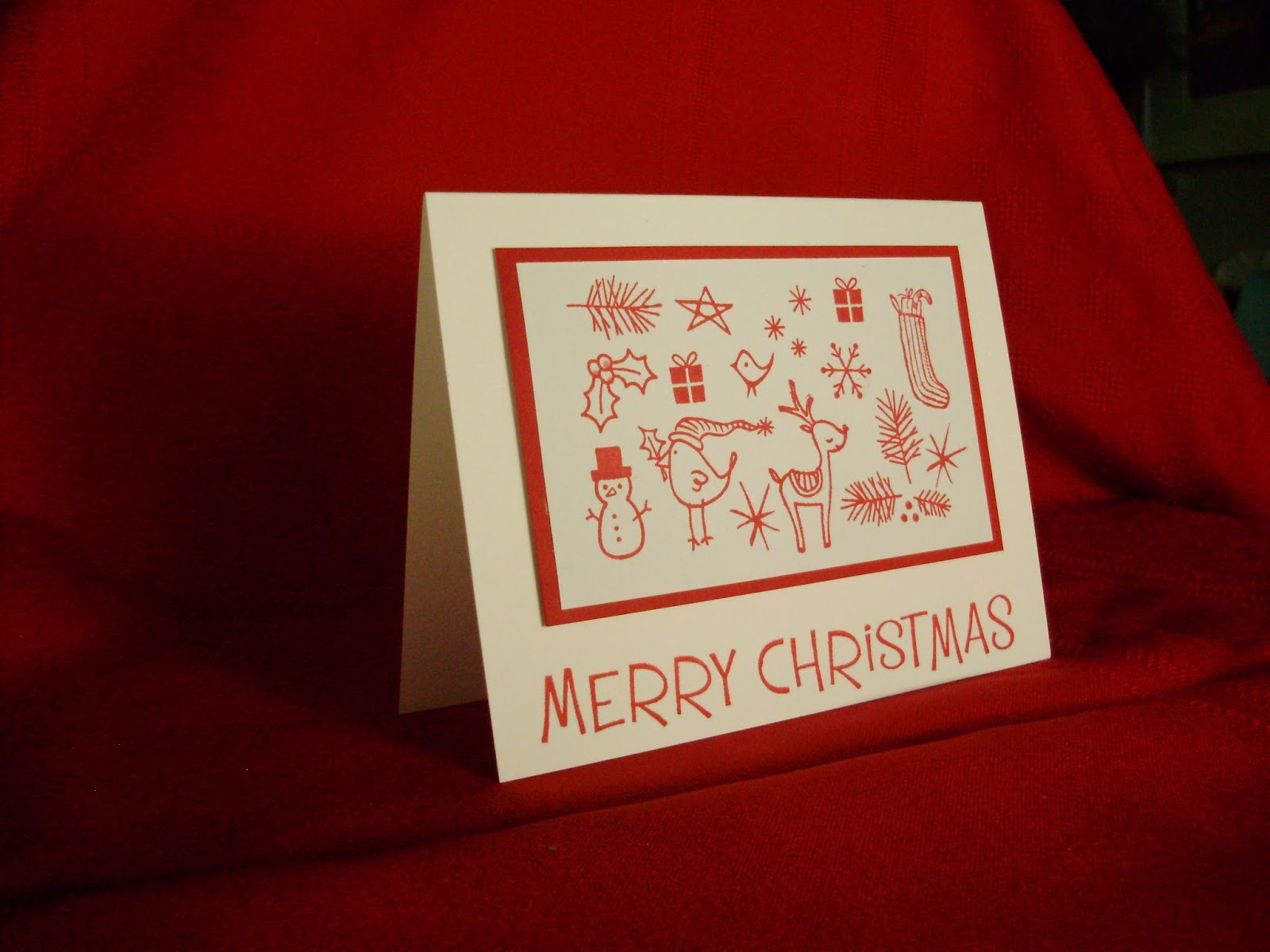 This card was based on an idea I saw somewhere online, and I apologize for not remembering the source. Maybe Kristina Werner? I always like red on white, not just for Christmas, so this little group of every tiny Christmas stamp I own was lots of fun to make. I made a small bunch of these.