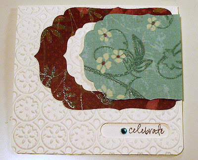 To finish up, I ran some blue card stock through the Cuttlebug with my swirls embossing folder, layered that on a piece of pink DP, and put the whole thing on a green card base. Last but not least, I added some bling in the form of some sweet little felt and rhinestone flowers I got from the dollar bins at Michaels.
