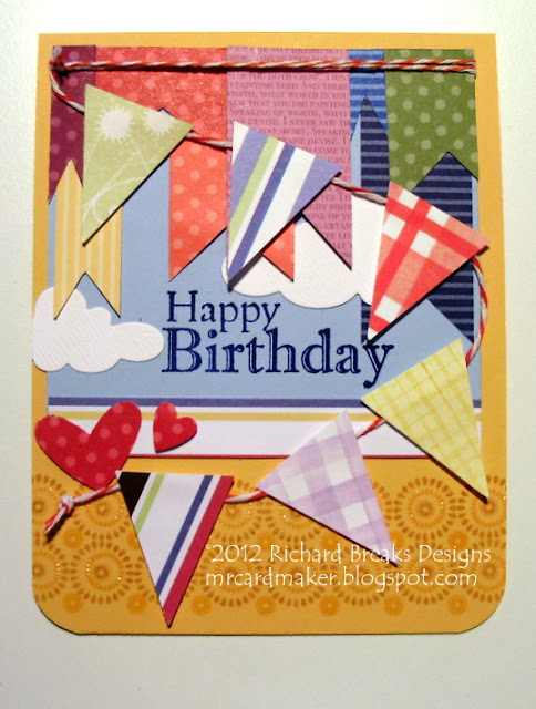 That's when I decided to add a heap more banner triangles to this project. I went into my scraps and chose different papers than the ones I used on the card already. (These are mostly DCWV, and AC papers, with one Fiskars paper, I think.) I grabbed my banner punch and went to town, arranging the pieces as I went to look like the breeze had caught them.