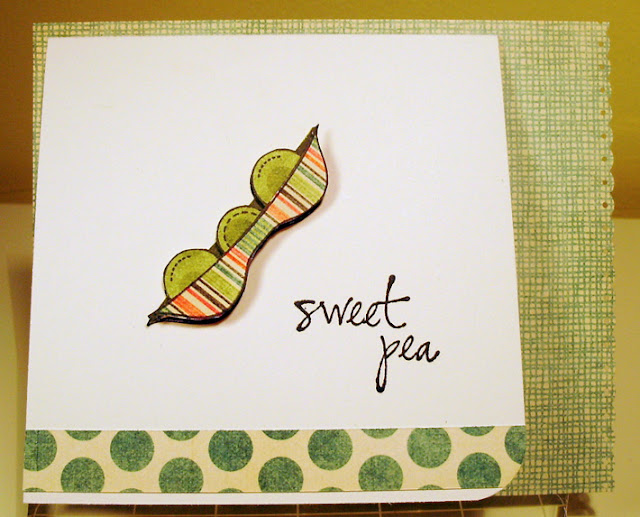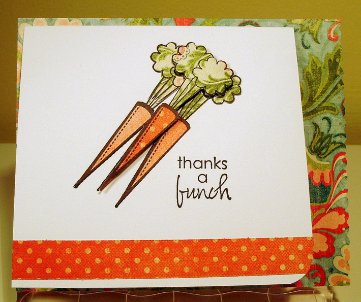 These are A2 (4.25"x 5.5") bases, with 4"x 4" white cards attached to them. I used GinaK Designs "Garden Fresh" set, and My Mind's Eye "Ooh La La" 6x6 paper pad to create these. To do the carrots, I masked and stamped three of the carrot image, then paper pieced them, popping the center carrot off the surface with some foam adhesive. You can just see where I used an edge punch to do a pierced scallop edge.