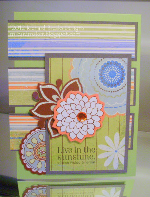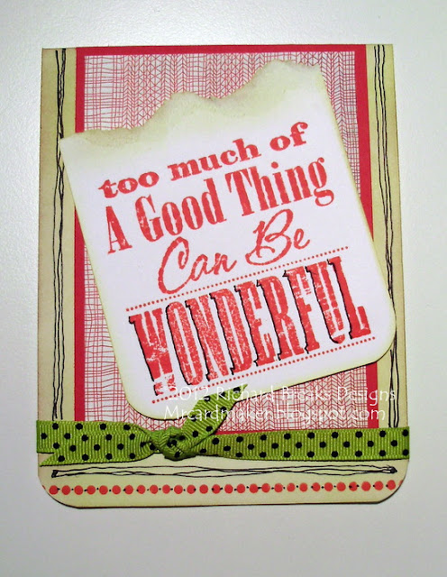 This one has a bit more effort, working the ribbon under the dp strips. Again, simple, simple.It's sometimes nice to just let the pretty paper do the work for you. I will remember these ideas when I am pressed for time. I think I would definitely round all the edges on this one if I recreate it, though.
