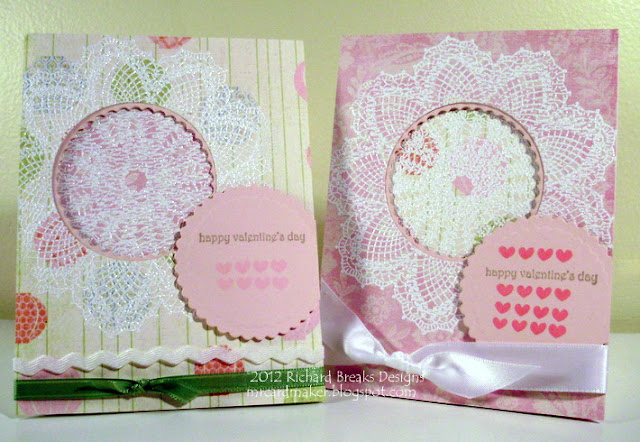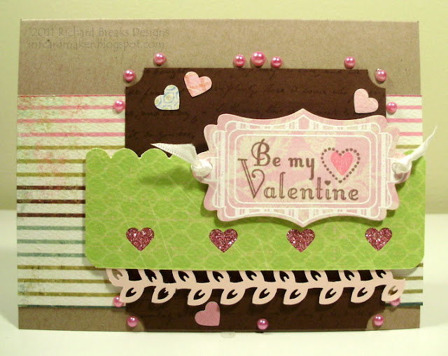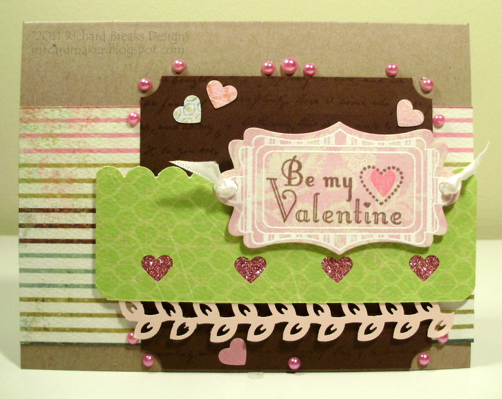 I did these with My Mind's Eye papers, on PTI white card stock bases. The pink CS is PTI as well. The ink is SU crumbcake with a SU stamp, and the hearts are from TPC Studio with Studio G ink. The ribbons are from my AC Moore dollar bin stash.