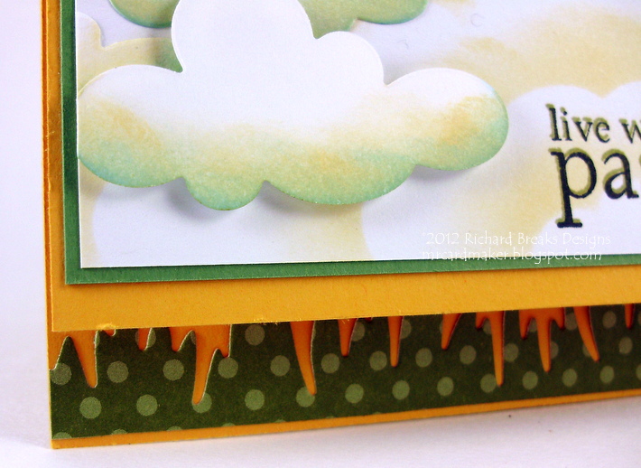 To finish everything up, I adhered the clouds in place with some adhesive and some foam tape, mounted the white piece onto some old wild wasabi stock, and adhered it to the card base. (the base is made from, I think, PTI Summer Sunrise. I have a multicolor pack from them, and I think it is that)