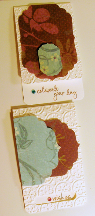 SO I made this little collection of cards and tags. I used SCRAPS! These are pieces of GinaK Designs Pure Luxury Cream card stock. I basically went with the sizes that they were, scored (thanks, scor-pal) and folded them, then ran the fronts thru the Cuttlebug with a sizzix embossing folder.