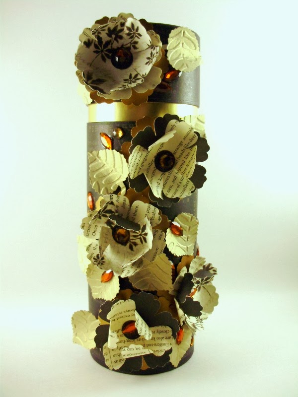 I punched and curled the petals of many a flower punched with Stampin' Up's Blossom punch, using some almost black, newsprint papers, and a leaf printed paper I have been hoarding for ages. There are also some gold metallic colored cardstock flowers as the base levels; a sort of brassy gold.
