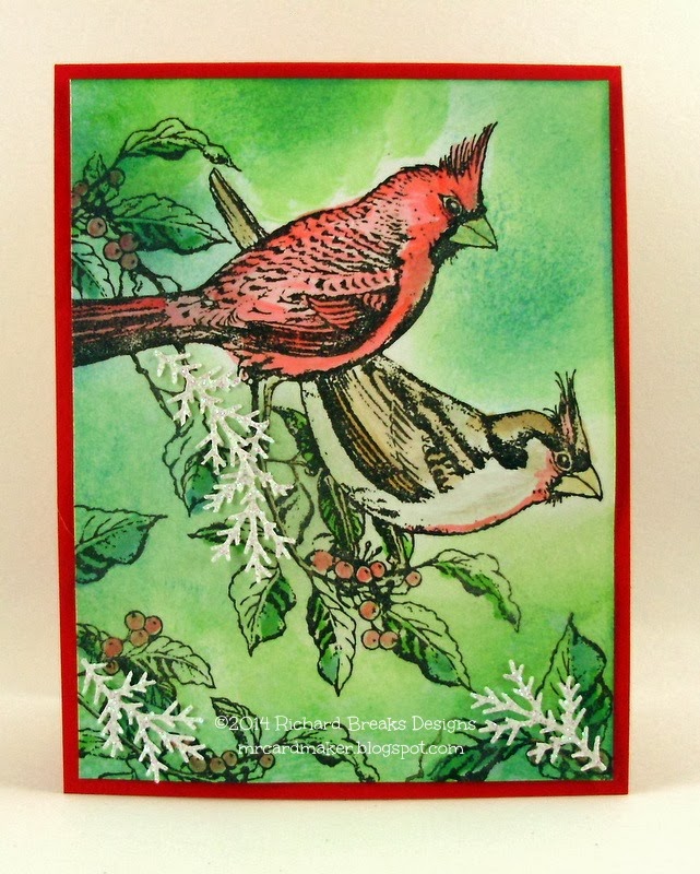 This one was stamped in Archival ink, so it wouldn't run when I hit it with the inks. I went a bit closer to real life coloring here, and I merely added some punched branches that were punched from white glitter paper to add a wintery feel.