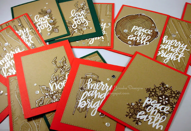 I used several stamp sets on these cards, mostly Stampin' Up and Stampendous.  Oh, what an impact a white gel pen can make on kraft !