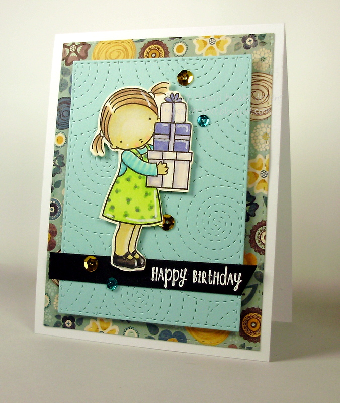 So, yeah, little girl with a stack of presents. Great for the holidays, sure, but who says this can't be for birthdays, too? Not this cardmaker, that's for sure...